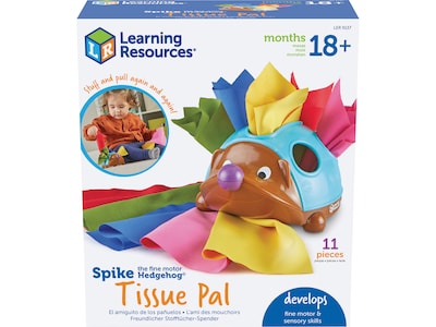 Kids can pinch, pull, and stuff their way to new fine motor and sensory skills with this Learning Resources Spike the Fine Motor Hedgehog Tissue Pal set's 10 fabric tissues in five vibrant colors. The machine-washable tissues store inside Spike's shell. Spike measures 4.5" x 5.5".