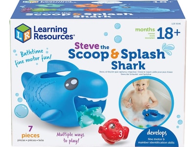 This Learning Resources Steve the Scoop & Splash Shark set is ready for bath time learning fun: scoop up the fish, pour water, or snap the fish together as you count from one to tree. The pieces store inside the shark which measures 5"H x 5"W x 7.75"D.