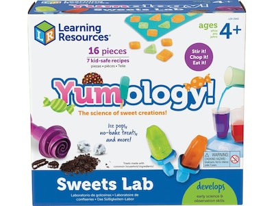 Yum! Learn the sweet science of tasty treats with the hands-on edible experiments of the Yumology! Sweets Lab from Learning Resources. Using common ingredients found around the pantry, kids build their early STEM skills as they mix, chill, and eat their own ice pops, juices, and no-bake treats with this cool candy lab. No heat is required! Whether they're measuring out ingredients, mixing colors together, or freezing treats from liquid to solid, kids gain kitchen science skills from the full-color guide's seven easy kids' experiments. Prepare toppings with the kid-safe Chippy Chopper, fill and freeze the cool Shapesicle ice pop mold, or mix up a lesson in candy chemistry within the lab-style beaker.