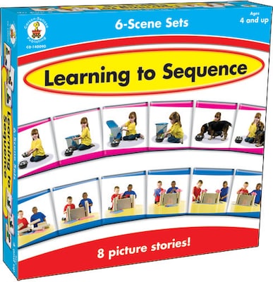 Carson-Dellosa "Learning to Sequence 6 - Scene" Board game is ideal for age group of 4 and above. Game includes 8 picture stories, 48 photographic cards and has directions in English, Spanish or French.