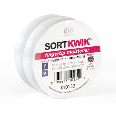 Count, sort, and file documents smoothly with this fingertip moistener. It is odorless, non-toxic, and won't stain, making it ideal for any professional environment. This Lee Sortkwik moistener comes in a compact container for easy, discreet storage.