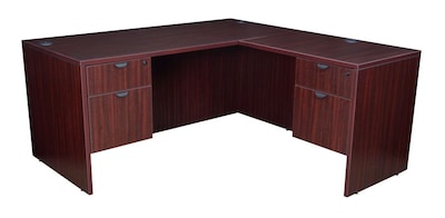 Versatility is just the beginning with so many Legacy desking options. This classic L-shaped corner desk is a great choice for professional and home offices alike. It comes with two box-file pedestals that each have one box drawer and one file drawer that accepts both letter and legal filing. All drawers lock and include ergonomically designed drawer pulls for convenience and ease in operation. Adjustable glides on the bottom of the base keep the desktop level and are easy to adjust. Wire management grommets keep cables clear of work areas. Finished in a classic Mahogany laminate, this desk coordinates with other Legacy furniture. The Legacy collection is constructed of a 1-inch thick thermal fused melamine laminate with a 3-millimeter commercial grade matching PVC edge. Laminates are scratch, stain and scald resistant. Legacy case goods are backed by a 10-year limited manufacturer's warranty.
