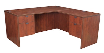 Versatility is just the beginning with so many Legacy desking options. This classic L-shaped corner desk is a great choice for professional and home offices alike. It comes with two box-file pedestals that each have one box drawer and one file drawer that accepts both letter and legal filing. All drawers lock and include ergonomically designed drawer pulls for convenience and ease in operation. Adjustable glides on the bottom of the base keep the desktop level and are easy to adjust. Wire management grommets keep cables clear of work areas. Finished in an attractive Cherry laminate, this desk coordinates with other Legacy furniture. The Legacy collection is constructed of a 1-inch thick thermal fused melamine laminate with a 3-millimeter commercial grade matching PVC edge. Laminates are scratch, stain and scald resistant. Legacy case goods are backed by a 10-year limited manufacturer's warranty.