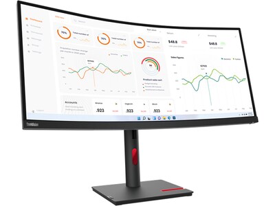 Get ready to take your efficiency to the next level with the Lenovo ThinkVision T34w-30 monitor's three-side NearEdgeless, immersive 34" WQHD curved display that draws you in, while its 3440 x 1440 resolution lets you take in all the finer details. A 21:9 aspect ratio delivers a panoramic experience, while a 1500R curvature delivers a consistent focal length across the screen. The large screen real-estate and curvature make sharing finer details with your teams easy and improves your focus and productivity as well. The monitor is a treat for the eyes with rich, vivid colors brought to life by a 99% sRGB color gamut. It cares for your vision too with Natural Low Blue Light technology that reduces harmful blue light emissions without color distortions. The ThinkVision T34w-30 monitor is designed for efficiency with a host of connectivity options including a USB Type-C (up to 75W PD), HDMI and DP ports, modular VoIP support for a video conferencing or audio with AI-enhanced MC60 and MS30 ports, and efficient network management with MAPT, PXE, and WOL (S3-S5). The ThinkColour software solution that can be easily deployed by Endpoint allows users quick control of display attributes, to help maximize productivity. The monitor's enhanced lift range gives it more flexibility to meet the working posture you find most comfortable. The lowest position gets lower to give you even more viewing comfort. It accommodates an open-slot phone holder that also supports tablets of different sizes to put all your screens within view, while cleaner cable management adds to a clutter-free desk. If you're looking for a cleaner desk, you can VESA mount this monitor too. The monitor's one-button joystick for quick access to display controls puts accessibility at your fingertips. You'll be pleased to know that the ThinkVision T34w-30 monitor meets the ecological and health standards of TCO 9.0 regulations and comes packed in recyclable paper cushioning that's safe for the environment too.