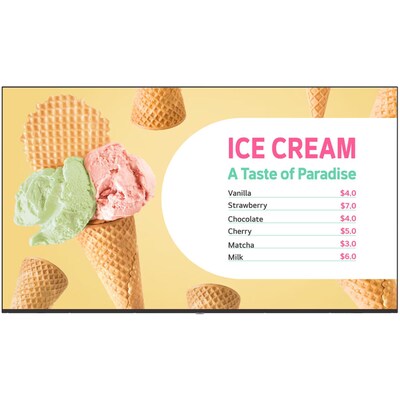 - The LG UM340E features a massive 75" display, perfect for classrooms, retail spaces, and business environments that require impactful visuals and professional-grade reliability