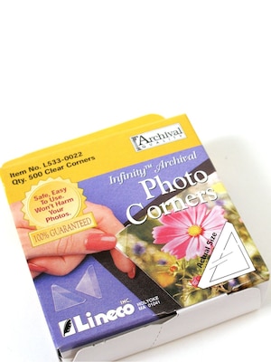 Clear, self-adhesive mounting corners. Use to mount light to moderate weight prints, photographs, and documents without adhesives ever coming in contact with the artwork. Made of acid-free, archival safe, photo safe polypropylene. Strong, easy to use, self-adhesive backed. Non-yellowing. Crystal clear. 5/8 in.