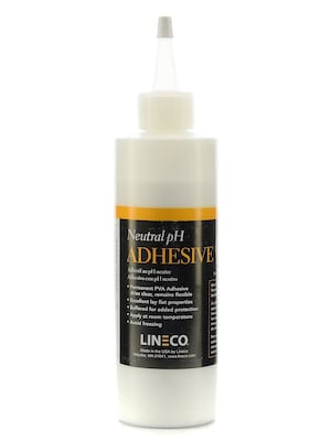This adhesive has a modified dextrine base which is reactivated or removed with water. It possesses excellent "lay flat" qualities and is excellent for paper repairs as well as for use in making special boxes, envelopes, or any use where a strong reversible adhesive is required. Apply generously to areas to be adhered and remove any excess with a damp cloth.