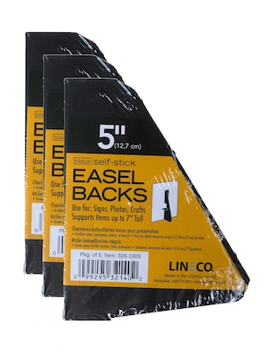 Lineco Single Wing Self-stick Easels provide an efficient display option that is easy-to-apply with a simple peel and stick application. Avoid the mess and dry time of glues. These easels prop up signs, photos, and crafts for fast and effortless presentation. This lightweight option comes flat offering both convenient storage and portability. Single wing easels support items measuring up to two to three inches taller than the easel back itself. Made in the USA. These black easels measure five inches tall and are sold as a pack of 15.