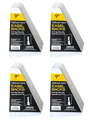 Lineco Single Wing Self-stick Easels provide an efficient display option that is easy-to-apply with a simple peel and stick application. Avoid the mess and dry time of glues. These easels prop up signs, photos, and crafts for fast and effortless presentation. This lightweight option comes flat offering both convenient storage and portability. Single wing easels support items measuring up to two to three inches taller than the easel back itself. Made in the USA. These white easels measure nine inches tall and are sold as a pack of 100.
