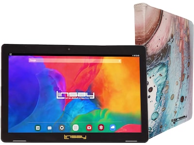 The 10.1" Linsay tablet featuring a quad-core processor, 2GB RAM, 64GB internal storage, 1280 x 800 IPS high resolution, and Google Android OS 13 with a space marble leather case keeps you in touch. This high-tech tablet is a flexible and powerful mobile Internet solution. Multitask with the 10.1" capacitive touch screen and Android operating system, and customize your home screen with favorite games, social media tools, productivity apps, and more. You'll find that the tablet makes staying connected a snap. E-mail, browse the web, and reach out to friends and family no matter where you are, right from your hand-held device. Capture and share all of life's best moments with the tablet's built-in camera. Listen to your favorite music, or watch TV and movies with clear audio through built-in stereo speakers. No matter how you choose to use your device, you'll find this tablet offers a powerful solution for both productivity and entertainment.