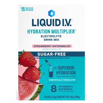 LIQUID I.V. Hydration Multiplier Sugar-Free Strawberry Watermelon Electrolyte Powder Drink Mix, 0.56 oz., 15/Box (EHC72598)