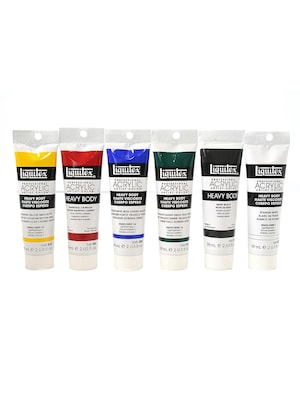 This studio set of acrylics contains six large 59 ml. (2 U.S. fl. oz.) tubes of Liquitex Heavy Body Acrylic Color: naphthol crimson, ultramarine blue (green shade), phthalo green (blue shade), titanium white, cadmium yellow medium hue, and mars black. H eavy Body Acrylic Colors (formerly known as High Viscosity Acrylic Colors) are heavy body paints with a high pigment load and intense color. They possess an exceptionally smooth, thick buttery consistency that retains brush strokes and has little to no wet-to-dry color shift. They-re great for thick/impasto applications. Also available in individual tubes and larger sizes .