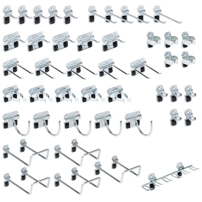 Manage all your storage and organizational needs with increased efficacy with Triton's LH1-KIT LocHook 46-Piece Zinc Plated Steel Hook Assortment for LocBoard. Its professional grade quality is developed to support 5S and Lean Manufacturing initiatives. These heavy duty LocHooks are innovatively designed, can be mounted in different directions and has a sturdy build that can withstand anything. Ideal for use in garages, factories and shops, LocHook and LocBoard can help you neatly organize your tools. This LH1 kit includes 1" single rod 30 degree bends (5), 4" single rod 30 degree bend(5), 1" double rod 30 degree bend(5), 3" double rod 30 degree bend (5), extended spring clip/spray can holder (5), standard spring clip (5), single ring tool holder (5), 3-7/8" curved hook (5), double closed end loop (5) and multi-prong tool holder (1).
