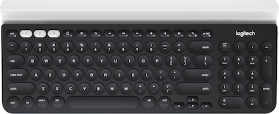 The Logitech K780 multi-device wireless keyboard is compatible with a wide range of devices and operating systems, simplifying your office's tech situation. Its pre-installed batteries last up to 24 months for extended typing, allowing you to avoid wired use that limits your mobility. Full-size, easy-to-read concave keys make typing quick and comfortable, and a built-in tray sits in front of the keyboard to support phones and tablets in a comfortable upright position for convenient use.