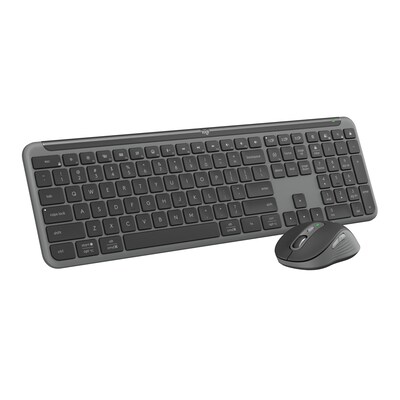 Type and click across computers effortlessly with the Logitech Signature slim keyboard and MK955 mouse made of recycled plastic. Make work-life magic with customization and shortcuts that keep you in control. Enjoy fast, precise scrolling and a familiar laptop-style keyboard feel that allows you to work even smarter with the Logi Options+ app's custom shortcuts. Quiet typing and clicking gives you more focus and less disturbance to others. Connect wirelessly with Bluetooth or the included Logi Bolt USB receiver, and stay concentrated for longer with up to 36 months of battery life for the keyboard and 24 months for the mouse.