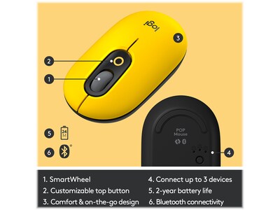 Get to know the playful wireless Logitech POP mouse designed to make personality shine on your desktop and beyond. Pick the Logitech POP mouse you love most from the range of designs, and make it your own with fun emoji customization. With SilentTouch clicks and a battery life of up to 24 months, take it anywhere you go. Connect the mouse to your desktop, laptop, or tablet using Bluetooth on Windows, macOS, iPadOS, and Chrome OS. Glide between up to three devices at a time with Flow, and shift instantly from the high-precision to speed scroll mode with the SmartWheel.