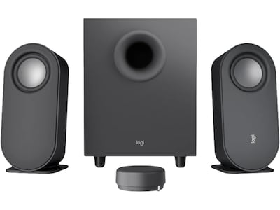Logitech computer speakers with subwoofer and wireless control. 80 Watts of power joins precise digital signal processing (DSP) to deliver immersive, lifelike sound. Hear the crisp high notes, the powerful mid and low-range, and all the bass you can handle. The wireless control dial and dual-position speakers let you control your sound and style. Adjust bass and volume from across the room. Connect via Bluetooth, micro USB, 3.5mm input, or all three—and switch between them. Even from across the room.