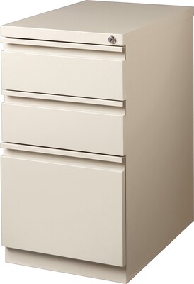 Mobile pedestal file features a high-side drawer with full extension for great access to your frequently accessed files. Design also features two box drawers so you have plenty of space to store supplies. Steel ball-bearing, drawer suspension delivers smooth drawer opening and closing. Factory-installed, core-removable lock keeps your letter-size files secure. Drawer pull extends across the entire, recessed drawer front for easy access. Casters are hidden from view and move the pedestal easily when necessary. Pedestal with a putty finish is made of steel and offers a 19-7/8" depth to slide easily into your cubicle or other office configuration. Mobile pedestal file meets or exceeds applicable ANSI/BIFMA standards.