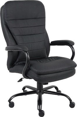 Executive swivel chair features double-plush cushions on the extra-wide seat and back and leather upholstery for a professional look and your comfort. Durable construction with reinforced leather offers an enhanced weight capacity of 350 lb. Loop arms areupholstered in leather. Arm height measures from 27-4/5" to 30-3/5" depending on chair height adjustment. Functions of this high-back chair include a one-paddle, spring tilt mechanism and pneumatic gas lift, seat-height adjustment from 19-7/10" to 22-2/5". Five-star, 27" metal base offers 3" double-wheel casters for easy chair movement. Seat size is 22-1/5" wide x 18-1/10" deep.