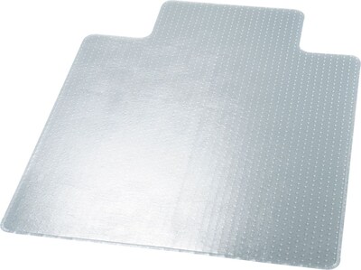 Clear rectangular chairmat will extend the life of your carpet by spreading out the pressure from your chair casters. It will also reduce fatigue by allowing easier rolling across your work space with less back and leg strain. Use on medium-plush carpetsincluding padding. Studded back is designed to achieve a strong grip without piercing or damaging your carpet backing, smooth edge for smoother rolling on and off your mat, and a 25" wide x 12" deep lip to cover the carpet under your desk when your chairis pushed all the way in. Crystal-clear chairmat lets the beauty of your carpeting show through. Heavy-duty material stands up to daily wear and tear.