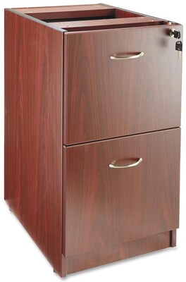 Fixed pedestal is part of Lorell Essentials Series Laminate Furniture with high-quality, Mahogany laminate construction. Pedestal includes two file drawers to store important files. Each file drawer includes hangrails and holds letter-size and legal-sizehanging files. Design also includes heavy-duty, ball-bearing suspension; 96mm metal drawer pulls with a silver brush finish; and 3mm PVC edges. Pedestal attaches to the underside of the top of an Essentials Series desk, credenza or return with the included fasteners and extends to the floor. It does not have a top and should not be used alone.