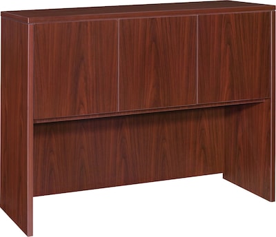 Hutch with three doors is part of Lorell Essentials Series Laminate Furniture with high-quality laminate construction and metal-to-metal, cam-lock connections. Hutch easily attaches onto 48" wide desk shells in this collection. Design includes one grommetfor easy cord management, backing, Mahogany laminate surfaces for durability and 3mm PVC edges.