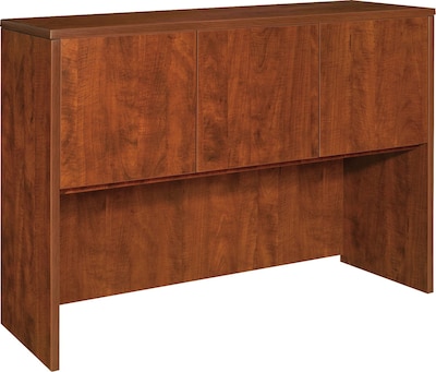 Hutch with three doors is part of Lorell Essentials Series Laminate Furniture with high-quality laminate construction and metal-to-metal, cam-lock connections. Hutch easily attaches onto 60" wide credenzas and desk shells in this collection. Design includes one grommet for easy cord management, backing, Cherry laminate surfaces for durability and 3mm PVC edges.