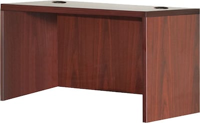 Rectangular desk shell is part of Lorell Essentials Series Laminate Furniture with high-quality laminate construction and metal-to-metal, cam-lock connections. Mahogany laminate top is 1" thick for durability. Use the two grommet holes in the top for easycord routing. Design also includes a full modesty panel for privacy, 3mm PVC edges and adjustable feet.