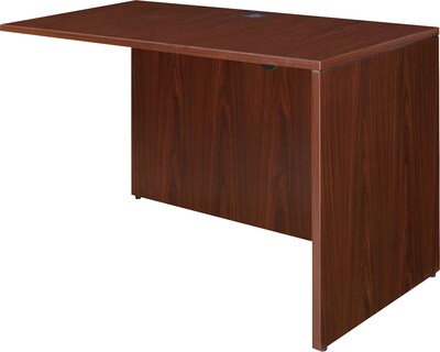 Rectangular return shell is part of Lorell Essentials Series Laminate Furniture with high-quality laminate construction and metal-to-metal, cam-lock connections. Use to create L-shaped workstations with bridges and desks. It is reversible for use in left-hand or right-hand configurations. Predrilled holes with metal inserts allow easy attachment by screws of pedestals. Mahogany laminate top is 1" thick for durability. Use the grommet hole in the top and center of the back panel for easy cord routing. Design also includes a full modesty panel for privacy, 3mm PVC edges and adjustable floor glides to stabilize the return on uneven surfaces. Return should not be used as a freestanding unit.
