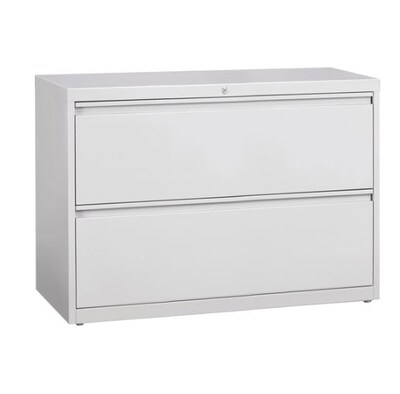 42" wide lateral file features two versatile drawers with hanging file rails for side-to-side filing in letter-size, legal-size or A4-size. Each drawer has a magnetic label holder for easy identification where you need it. Design also features a core-removable lock for security, dual locking bars, full-width pull, ball-bearing slide suspension for smooth opening and closing, reinforced base, and four adjustable leveling guides for stabilization. Interlock system prohibits the extension of more than one drawer at a time for your safety. Counterweight prevents tipping. Lateral file meets or exceeds applicable ANSI/BIFMA standards.