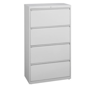 36" wide lateral file features four versatile drawers with hanging file rails for side-to-side filing in letter-size, legal-size or A4-size. Each drawer has a magnetic label holder for easy identification where you need it. Design also features a core-removable lock for security, dual locking bars, full-width pull, ball-bearing slide suspension for smooth opening and closing, reinforced base, and four adjustable leveling guides for stabilization. Interlock system prohibits the extension of more than one drawer at a time for your safety. Counterweight prevents tipping. Lateral file meets or exceeds applicable ANSI/BIFMA standards.