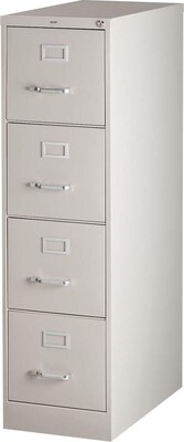 Commercial-grade vertical file features four high-sided drawers that accommodate letter-size, hanging file folders without additional accessories. Slide suspension allows maximum drawer extension. Steel ball bearings provide smooth, quiet drawer performance. Even fully loaded, these drawers open with ease. Adjustable wire followers keep files upright. 26-1/2" deep vertical file also features a core-removable lock for security, aluminum label holders for easy referencing, convenient pull handles and heavy-gauge steel construction with recycled content. Vertical file meets or exceeds ANSI/BIFMA industry standards.
