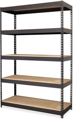 Riveted Steel Shelving offers sturdy storage space for your heavy supplies. Shelving unit includes five shelves and holds a total capacity of 3,800 lb. of evenly distributed weight with its heavy-duty, riveted steel construction. Each 3/8" thick shelf ismade of treated particleboard that is fully compliant with the California Carb Act of 2011. Boltless design assembles with rubber mallet in less than 30 minutes. Shelving assembles vertically or horizontally to fit most any space. Sleek black styling features riveted shelf attachments and a smooth, powder-coat finish that is rust-resistant.