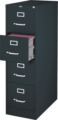 Commercial-grade vertical file features four high-sided drawers that accommodate legal-size, hanging file folders without additional accessories. Slide suspension allows maximum drawer extension. Steel ball bearings provide smooth, quiet drawer performance. Even fully loaded, these drawers open with ease. Adjustable wire followers keep files upright. 26-1/2" deep vertical file also features a core-removable lock for security, aluminum label holders for easy referencing, convenient pull handles and heavy-gauge steel construction with recycled content. Vertical file meets or exceeds ANSI/BIFMA industry standards.