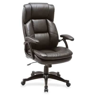 This high-back leather chair offers a bonded leather back and seat for deluxe comfort. Coated nylon arms offer soft padding. Functions include pneumatic seat-height adjustment, 360-degree swivel, tilt, tilt tension and tilt lock. Black nylon, five-star base is equipped with casters for easy movement.
