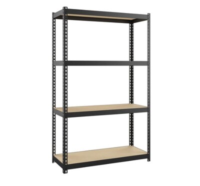 - Durable steel construction with riveted shelf attachments features gunmetal gray, rust-resistant powder coat finish and particleboard shelves