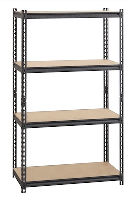 Iron Horse Riveted Steel Shelving offers a boltless design for simple assembly. It holds up to 2,300 lbs. of evenly distributed weight on its particleboard shelving. The four shelves are supported by a steel frame with a powder-coat finish in gunmetal gray for durability. Shelving assembles vertically or horizontally.