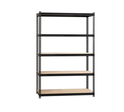 Iron Horse Riveted Steel Shelving offers a boltless design for simple assembly. It holds up to 2,300 lbs. of evenly distributed weight on its particleboard shelving. The five shelves are supported by a steel frame with a powder-coat finish in gunmetal gray for durability. Shelving assembles vertically or horizontally.