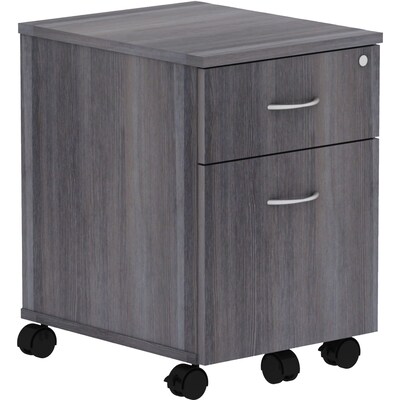 This mobile pedestal is part of the Lorell Relevance Series, versatile and stylish office furniture that configures to meet your needs. Weathered Charcoal laminate exterior matches other units in the series for a cohesive, professional look. Locking pedestal includes four dual-wheeled casters (two locking) for easy mobility, one box drawer for storing supplies and one file drawer for securing your letter-size hanging file folders. Adjustable leveling feet help keep the pedestal even on uneven surfaces.