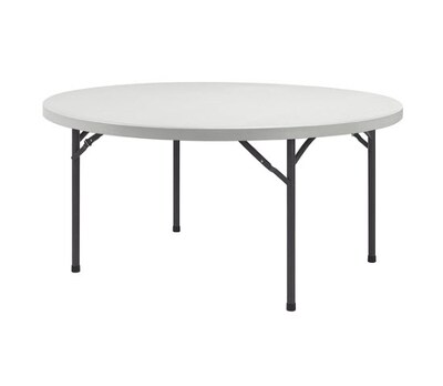 Round banquet table is designed for light-duty use indoors or outdoors. The 2" thick, square-edge top is made of blow-molded, high-density polyethylene for a sturdy surface. 1" tubular steel legs are powder-coated for durability. 60" diameter table supports up to 700 lb. evenly distributed and comfortably seats five or six.