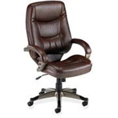 Executive high-back chair, part of the Lorell Westlake Series, features bonded leather upholstery with overstuffed cushions, a waterfall seat and padded arms for exceptional comfort. Functions include pneumatic seat-height adjustment (18-1/4" to 21-3/4"),360-degree swivel, tilt, tilt tension, and tilt lock. Polyurethane frame offers a champagne-colored, powder-coat finish. Seat cushion measures 21" wide x 20-1/2" deep. Back cushion size is 21" wide x 29-1/4" high. Arm height from the floor adjusts from 26-3/4" to 30-1/4". High-back chair meets or exceeds applicable ANSI/BIFMA standards. Meets the CA117 fire-retardant standard.
