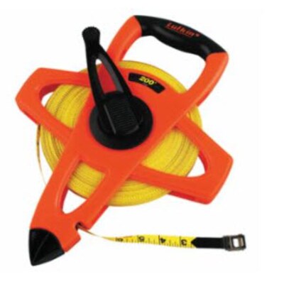 Lufkin® Single side measuring tape features 200' x 1/2" C1 blade that is made of durable fiberglass with yellow clad finish. Tape with open four-arm frame design comes in a lightweight, strong case and has folding end hook for true-zero measurements.