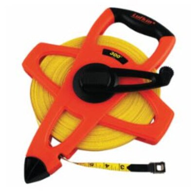 Lufkin® Single side measuring tape features 300' x 1/2" C1 blade that is made of durable fiberglass with yellow clad finish. Tape with open four-arm frame design comes in a lightweight, strong case and has folding end hook for true-zero measurements.