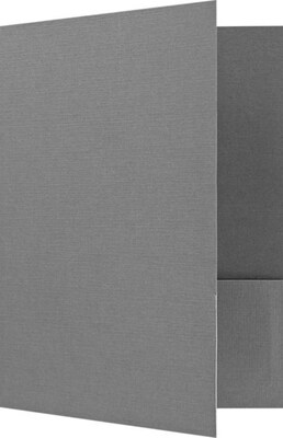 LUX 9 x 12 Presentation Folders are the perfect two pocket folders for holding documents, brochures, sales materials, tax documents and much more! 9 x 12 Presentation Folders in Sterling Gray Linen with a standard two pocket design are perfect for holding standard letter size 8 1/2" x 11" paper, documents, print media, brochures, stepped inserts and other professional uses. The two interior pockets measure 4" in height and the right pocket features card slits to securely hold and display standard size business cards (3 1/2" x 2"). Both pockets are also die-cut in a v-split style to prevent buckling when opening and closing the covers. This folder is created from thick, durable 100lb. cover stock in a classic, medium gray color with a high-quality linen texture. The square corners of this standard size presentation folder were expertly die-cut for a clean, professional look.