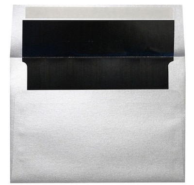 LUX® Size A7 envelope with peel and press in silver metallic with black lux lining color has a basis weight of 80 lbs. Lined flap envelope measures 5 1/4" x 7 1/4" is sold as 50 per pack.