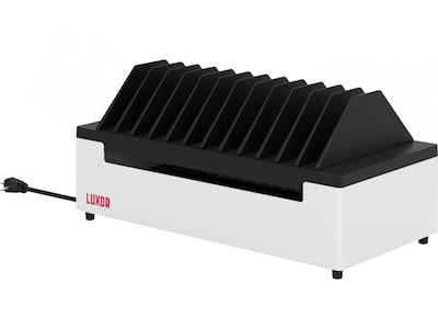 Simultaneously charge up to 12 Chromebooks, tablets, laptops, MacBooks, phones, and more with the Luxor space-saving AC charging station. Highlights include an open design that doesn't restrict device height and length; moveable divider fins that allow you to select between two slot widths for a customized fit, and compatibility with most tablets and laptops with screens up to 16". Hidden in the base is a 14-outlet UL-listed AC power strip, plus plenty of space to keep cables and power supplies neat, organized, and out of view. Grippy rubber feet keep the charging station stable and secure. Perfect as a classroom charging station and great for libraries, medical clinics, retail establishments, and any other organization in need of a space-efficient, tidy solution to keep devices powered up.