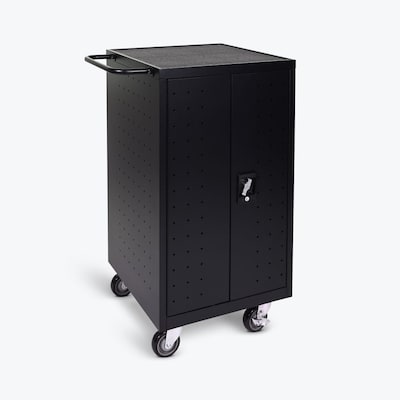 Lockable steel doors and rolling casters provide a rugged security or storage solution that's easy to move. And with an electrical assembly and cord management system built inside the back of the unit, you're able to organize and charge multiple devices at once – from laptops to Chromebooks. Rubber-coated dividers won't scratch devices, when putting them away or taking them out and help provide impact protection during transit. And assembly is simple – just attach the casters and handle and you're ready to roll.