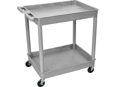 Distribute tools and other supplies throughout the building or office using this Luxor large tub cart. Two open shelves offer easy access to materials stored, and the raised edges keep items in place. This cart is made from a durable thermoplastic resin material that resists scratches, dents, and stains. Featuring a convenient push handle, this Luxor gray two-shelf utility cart can easily navigate tight spaces.