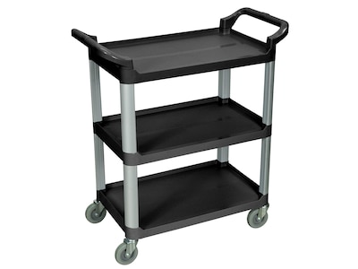 Transport supplies throughout the office or building with this Luxor three-shelf serving cart. The open design allows easy access to the contents on the shelves while the dual handles offer maximum utility and convenience. Perfect for light-duty applications, this durable cart can support up to nearly 200 pounds. This Luxor black serving cart is chip- and scratch-resistant, providing ultimate durability.