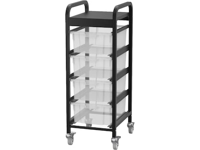- Black metal lug cart with four gray removable storage bins and slotted label holders